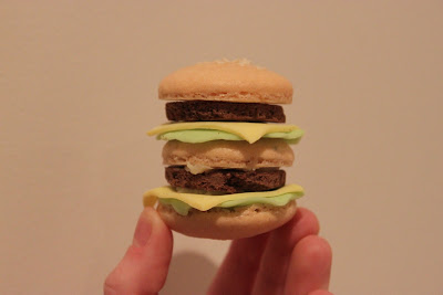 However, I didn't want to make plain macarons.. I wanted to do something a bit more creative. Watching Masterchef contestants try and recreate Heston Bluemnthal's amazing dishes, I was inspired to create something sweet that looked like a savoury item. I thought a fast food item would be fun to do, so here is a sweet (and very small) take on the Big Mac.